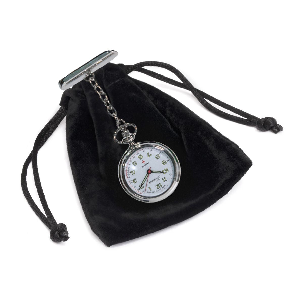 The easy-read white dial features clear Arabic numerals and a contrasting red seconds hand for pulse counts. A classic brooch pin with a short chain keeps the watch secure and hands-free on your uniform. Supplied in a smart black pouch, ready to gift or add to your kit.