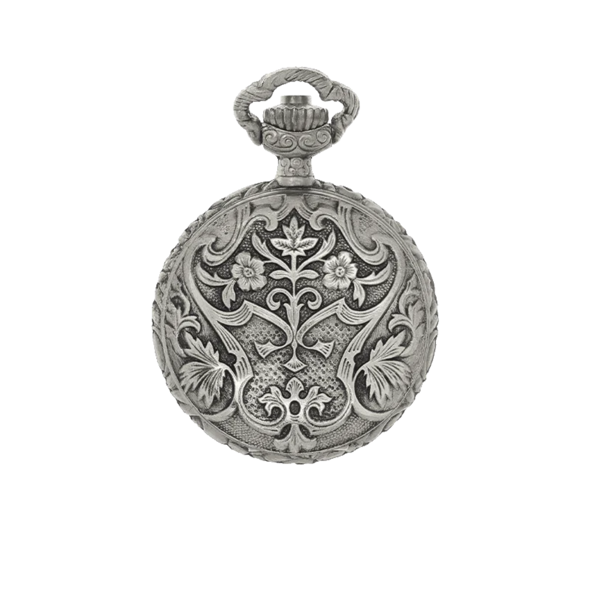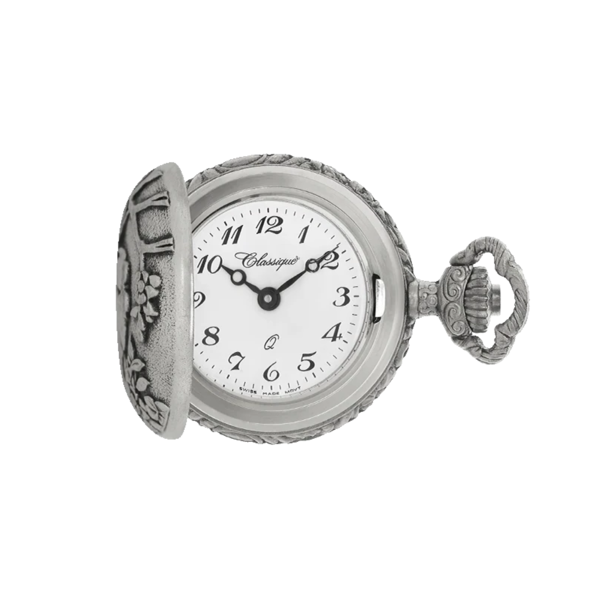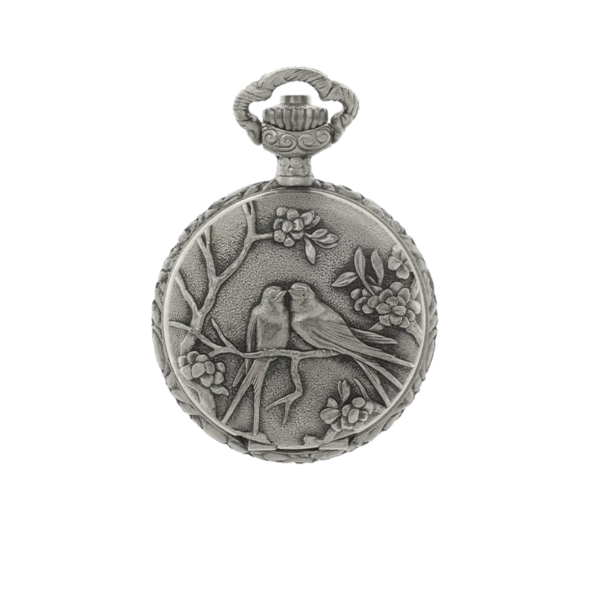 Crafted in an antique silver-tone finish, this feminine timepiece features two delicate robins perched on blossoming branches on the front, and an ornate floral motif on the reverse. Open the case to reveal an easy-to-read white dial with classic black numerals, powered by precise Swiss quartz movement for reliable timekeeping.